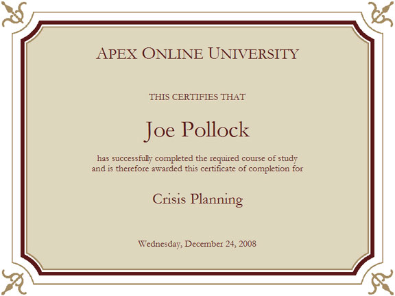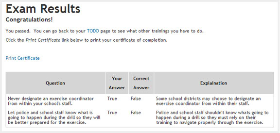 The Exam Results Page appears and shows whether you passed or failed. It shows which questions you had incorrect and an explaination of the correct answer. From this page you may also print your Certificate of Completion and access your To Do list.