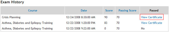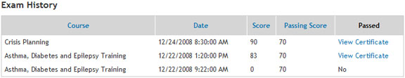 The Exam History shows the courses you've attempted, your score and whether you've passed or not.