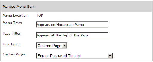 Note: You can add the link to the Top Menu or Left Menu of your homepage.The Manage Menu Item tool appears.